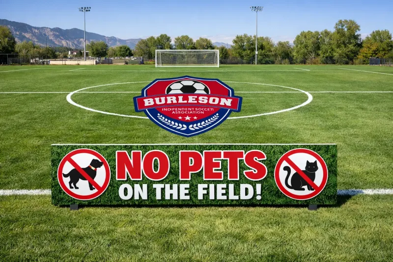 In accordance with the City of Burleson code, animals are not permitted on the fields, including emotional support animals. As much as we love our furry friends, the fields can be unsafe for them. Fast-moving soccer balls and children running at full speed can easily result in accidental injuries.